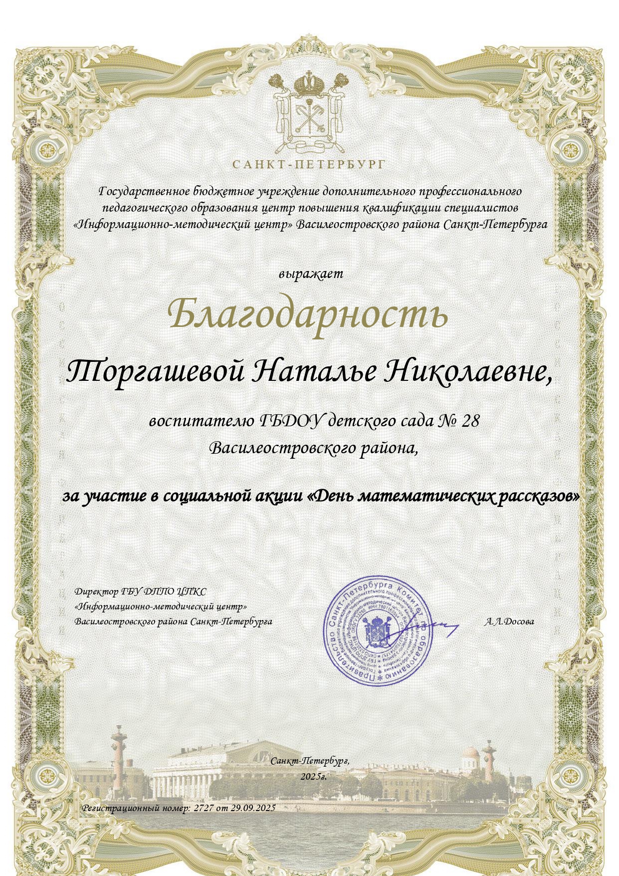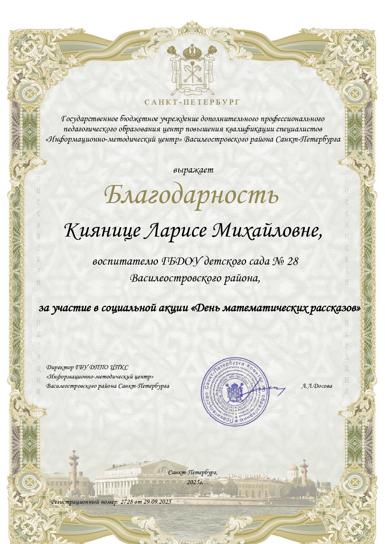 29.09.2025 воспитатели Торгашева Наталья Николаевна и Кияница Лариса Михайловна вместе со своими воспитанниками группы "Зайчата" приняли участие в социальной акции "День математических рассказов"!