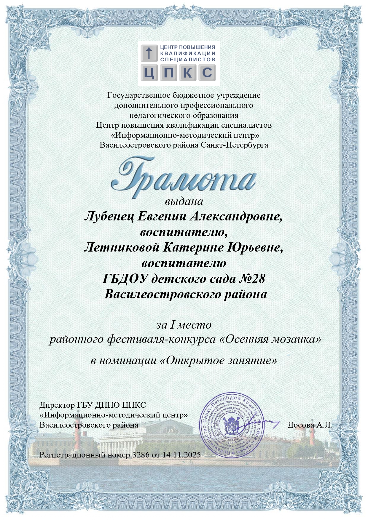 В ноябре 2025г. команда педагогов - Лубенец Е.А., Летникова К.Ю., Иванова О.Ю., Олифир Е.А. стали победителями районного фестиваля-конкурса "Осенняя мозаика".